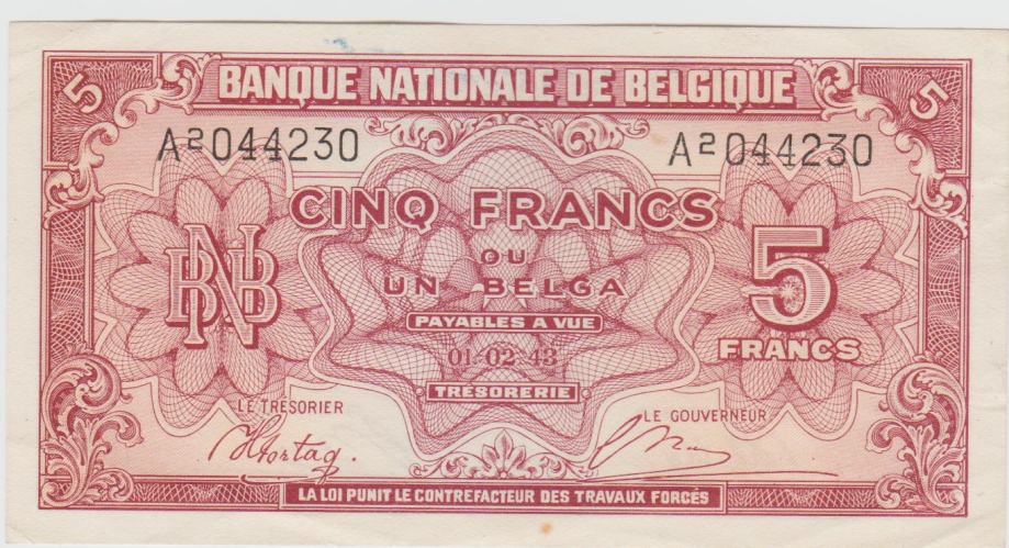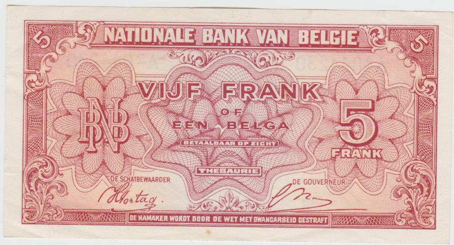 Prodam REDEK bankovec 5 FRANCS P121( BELGIJA) 1943. XF++ Kvaliteta.