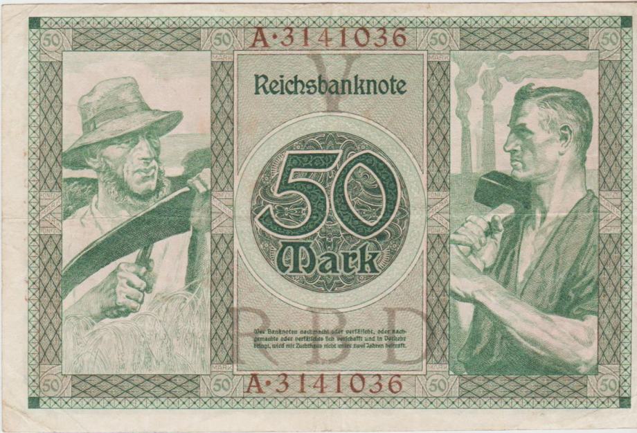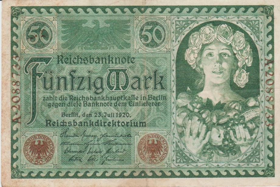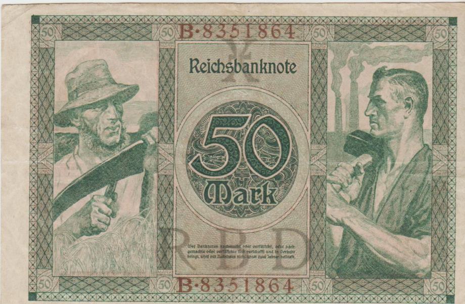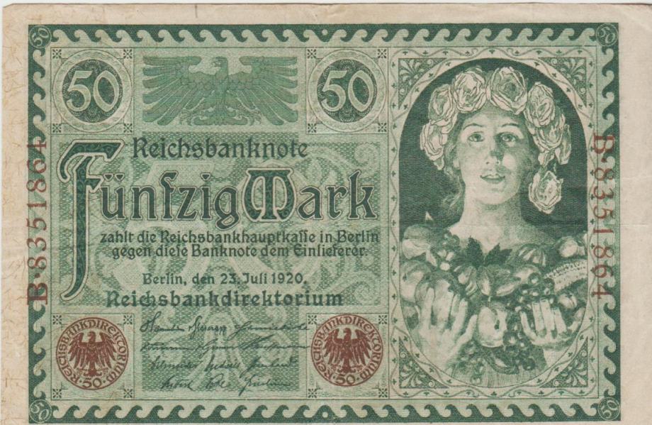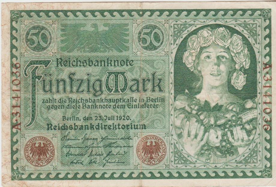 Prodam bankovec 50 MARK Wor:P-68, Ros:R-66 (NEMŠKI RAIH NEMČIJA 1920.VF Kvaliteta.CENA JE ZA 1 BANKOVEC.