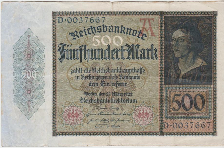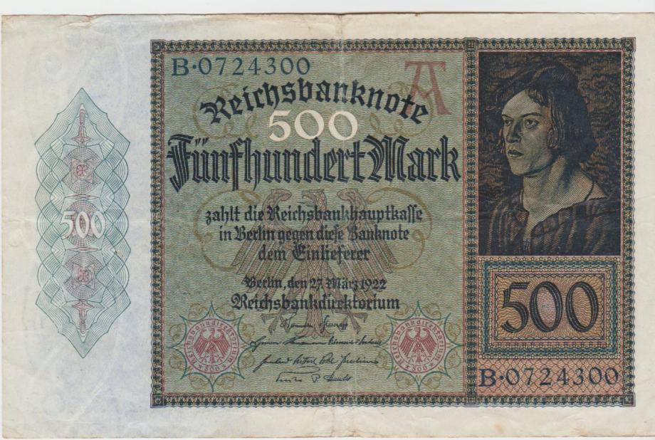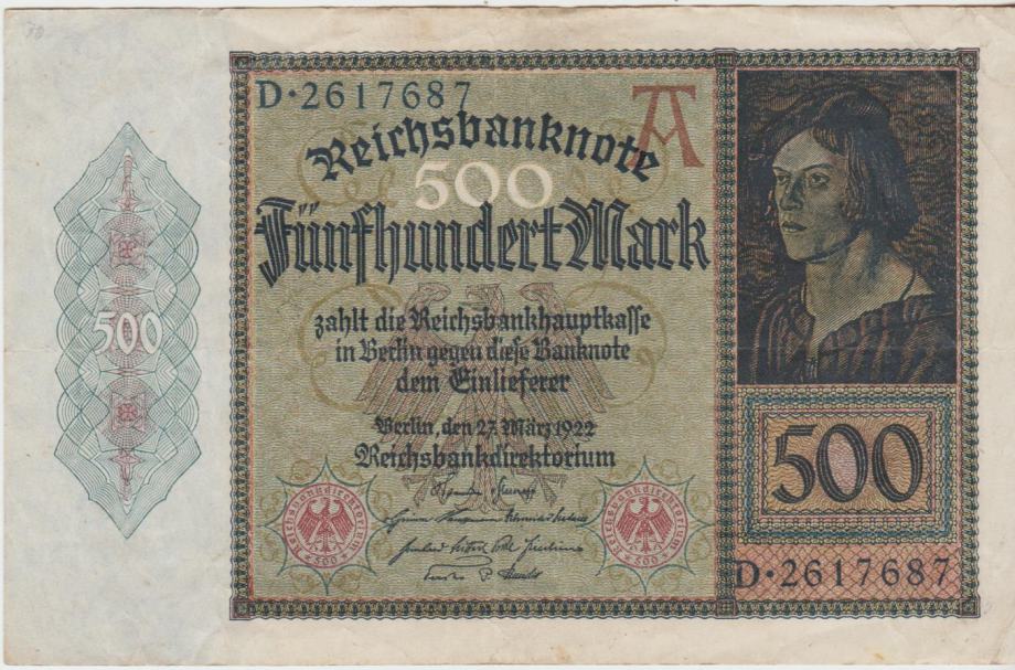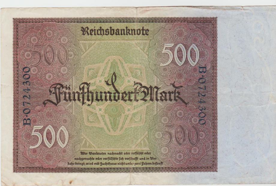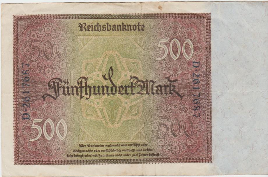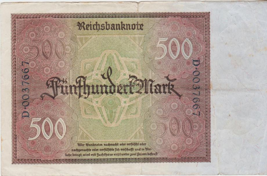 Prodam REDEK BANKOVEC 500 MARK 1922. P-73 (NEMŠKI REIH NEMČIJA) VF kvaliteta.CENA JE ZA 1 BANKOVEC.