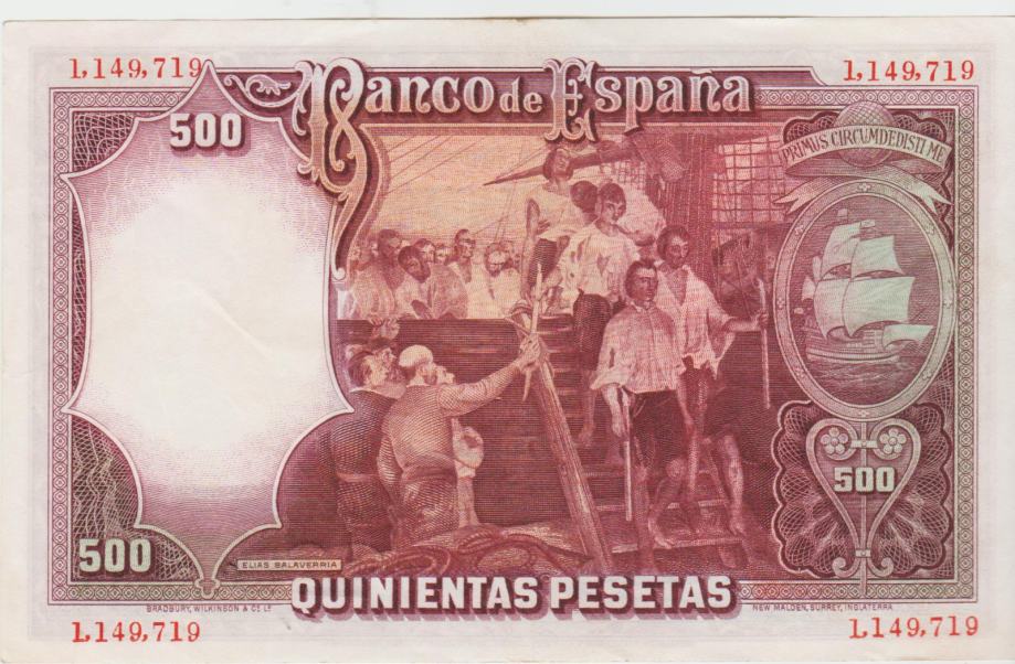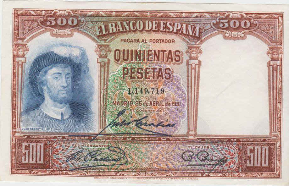 Prodam REDEK BANKOVEC 500 PESETAS P84 J.S.ELCANO (ŠPANIJA) 1931.XF++ kvaliteta.