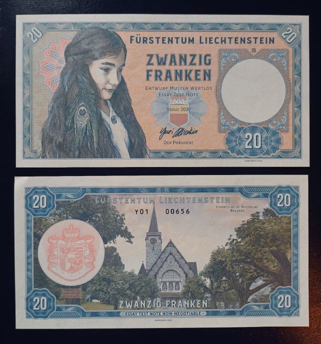 Fantazijski bankovec Lihtenštajna z zaščitnimi elementi, na pravem papirju...