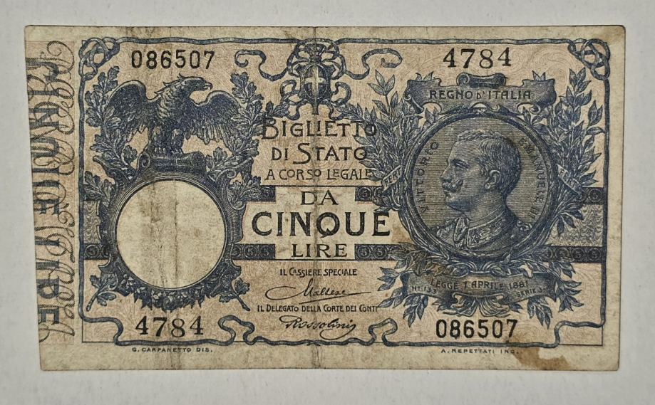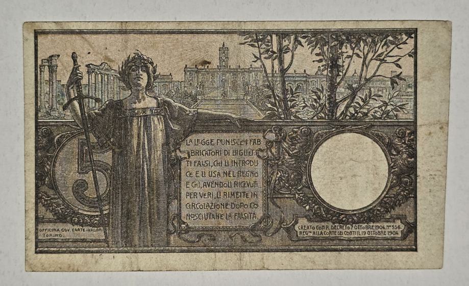 Prodam redkejši bankovec 5 lir Italija 1904.
