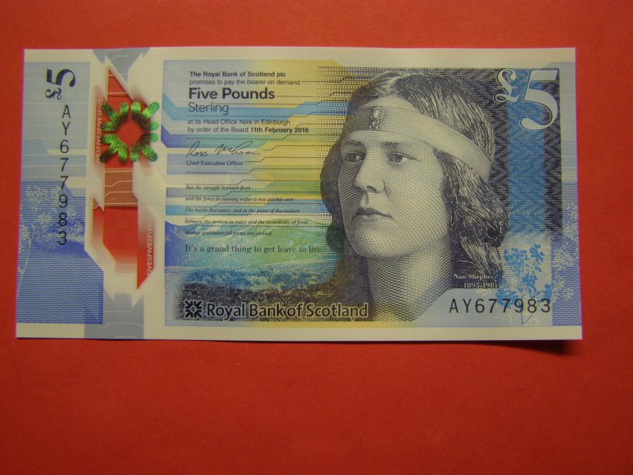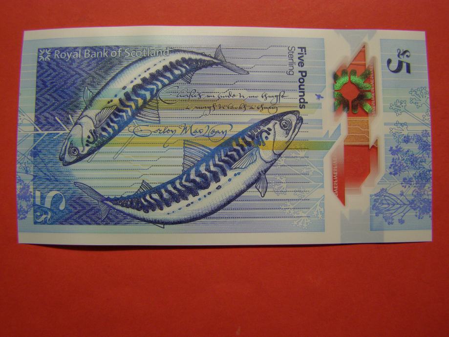 Prodam polimerni bankovec za 5 Funtov iz Škotske - Royal Bank of Scotland, kot ga lahko vidite na fotografijah. Bankovec nikoli v obtoku, povsem nov in UNC kvalitete.