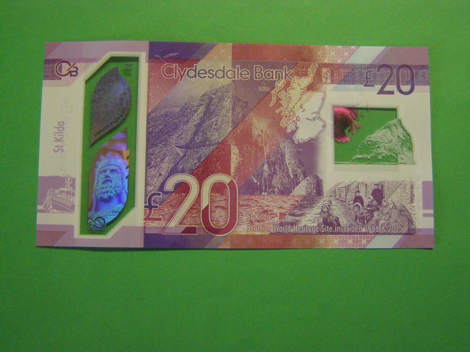 Prodam POLIMERNI bankovec za 20 Funtov iz Škotske - Clydesdale Bank, kot ga lahko vidite na fotografijah. Bankovec nikoli v obtoku, povsem nov in UNC kvalitete.