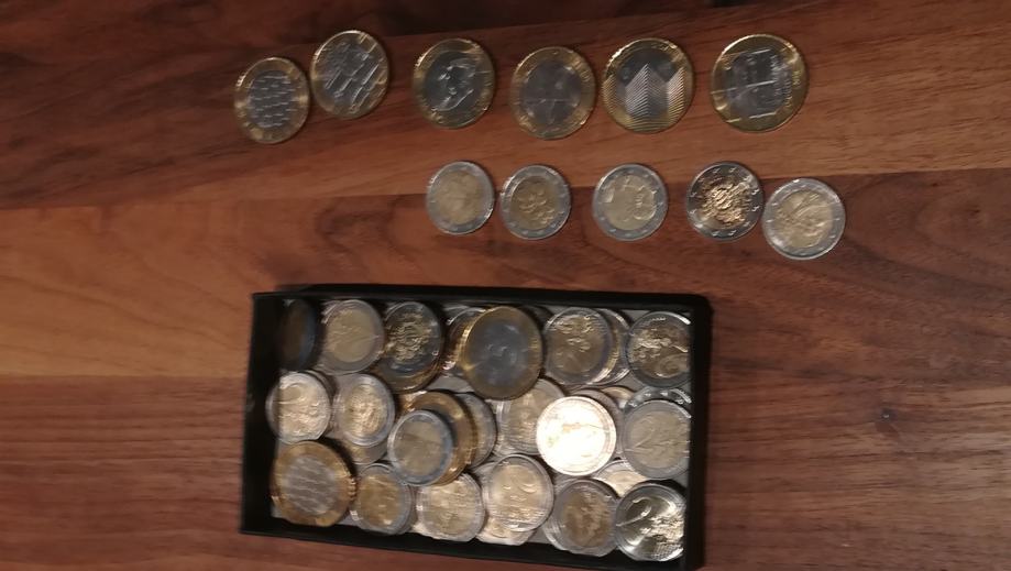 Različni slovenski in drugi spominski evro kovanci za ena, dva in tri evre.
