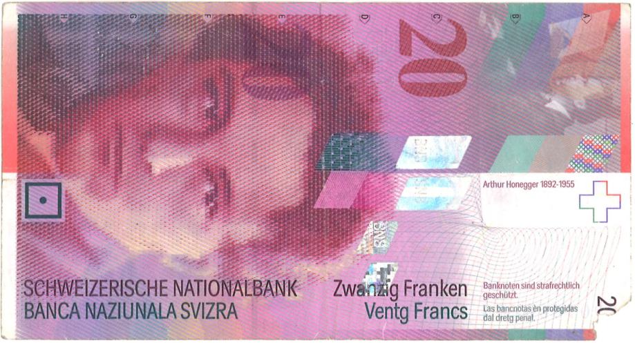 Prodam bankovec na fotografiji: Švica 20 frankov arthur Honegger, spodnji desni vogal manjka