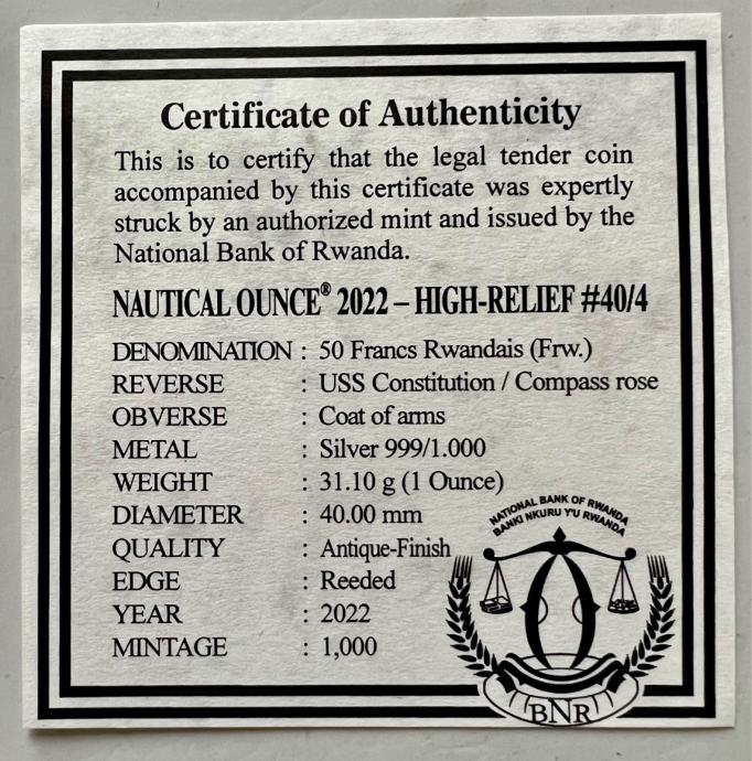 Redka ULTRA HIGH RELIEF edicija priljubljene serije Nautical ounce. Impozanten kovanec z globino reliefa kar 4mm!