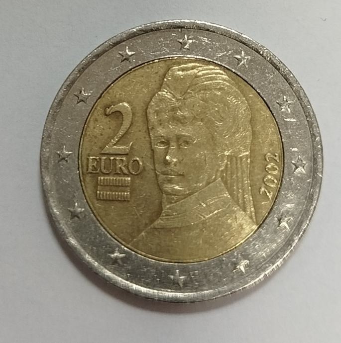 Avstrijski kovanec za 2 € prikazuje Bertho von Suttner, znano mirovno aktivistko in prvo žensko, ki je prejela Nobelovo nagrado za mir. Kovanec je bil skovan leta 2002 in ima nominalno vrednost 2 evra. Država izdelave je Nemčija. Kovanec ni certificiran.