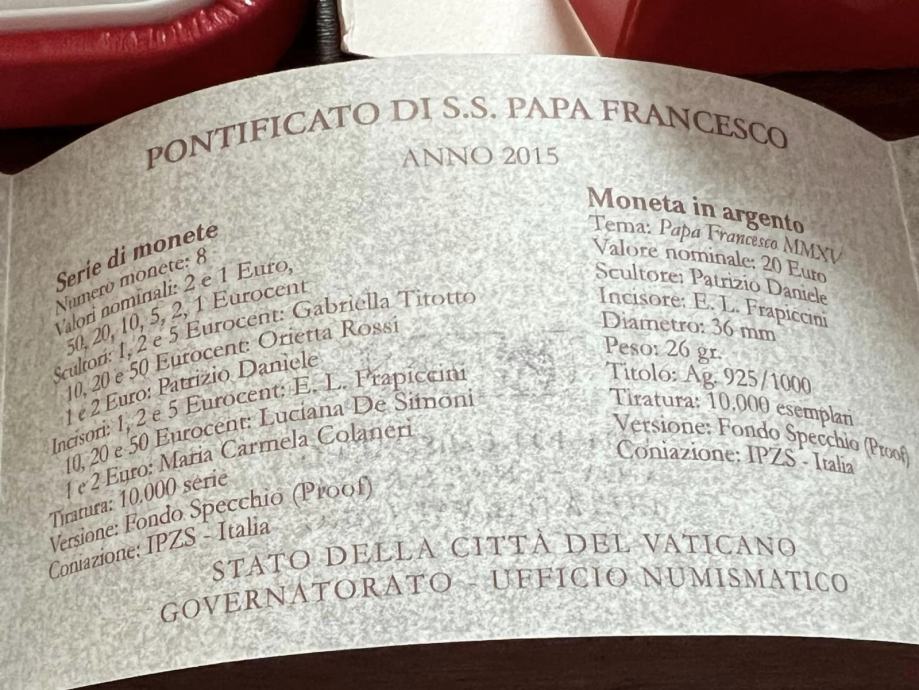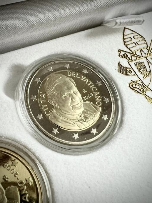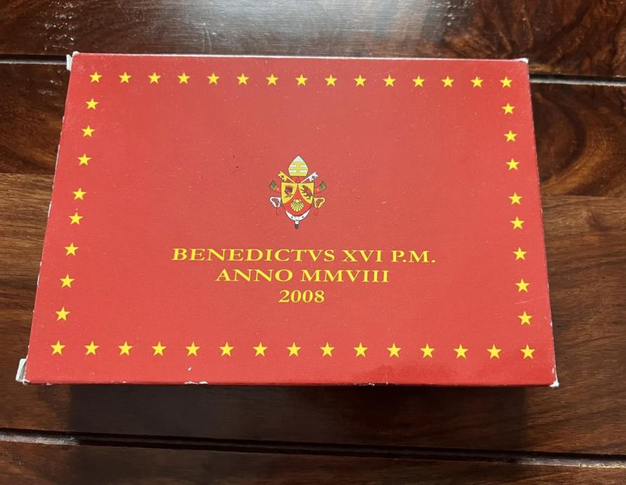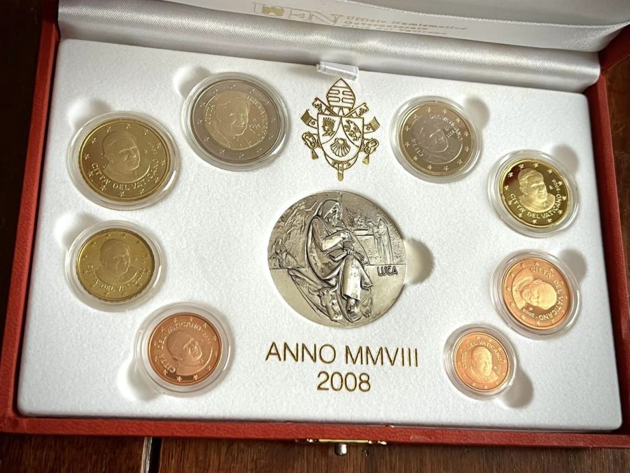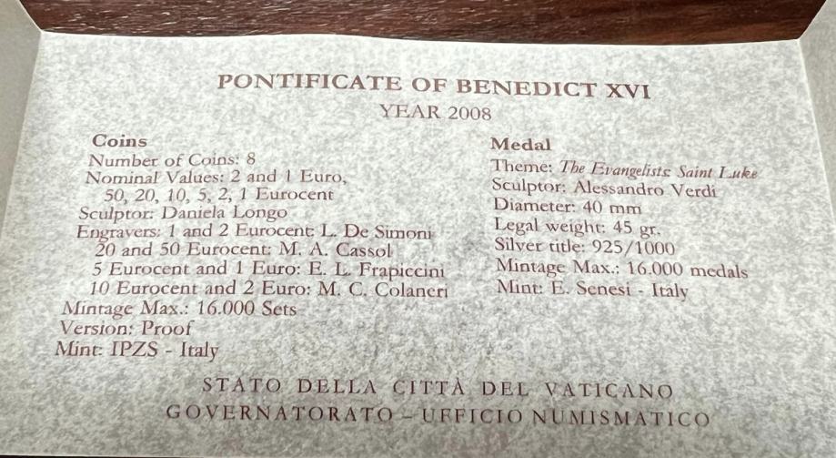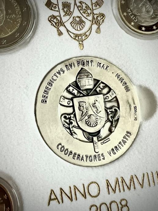 Vatikanski euro de luxe proof set letnik 2008. Vsebuje vse apoene euro kovancev za leto 2008 v proof tehinki koavanja ter veliko letno papeževo srebrno medaljo. Medalja je kovana iz srebra .925, teže 45 gramov, premer 40 mm.