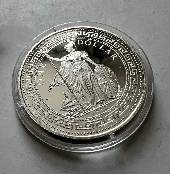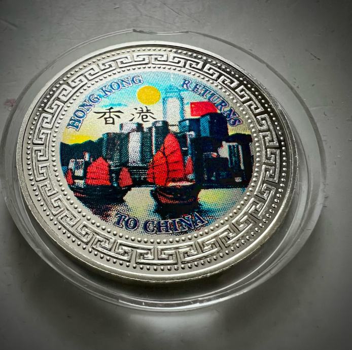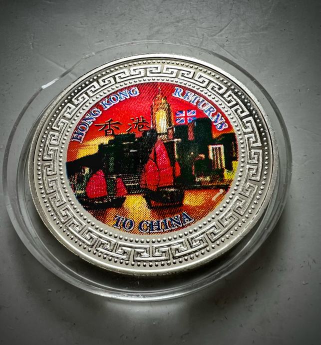 Priložnostna srebrnika britanske kovnice, kovana ob zgodovinskem dogodku, ko je britanska krona vrnila ozemlje Hong Konga Kitajski, ob polnoči 01. 07. 1997.