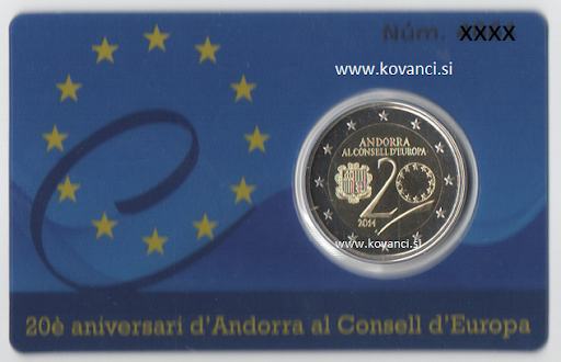Priložnostni kovanec Andorra 2 EUR 2014 Svet Evrope - poliranec. Kartica + origina embalaža, 20.obletnica članstva v Svetu Evrope.