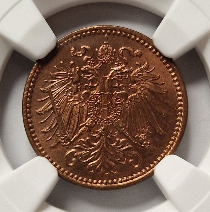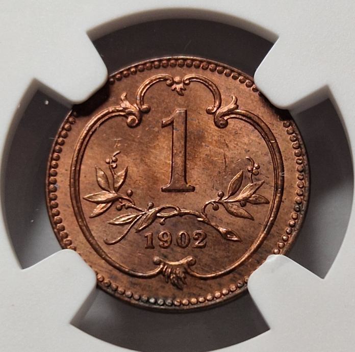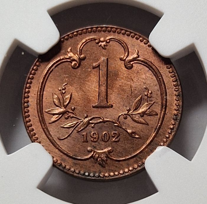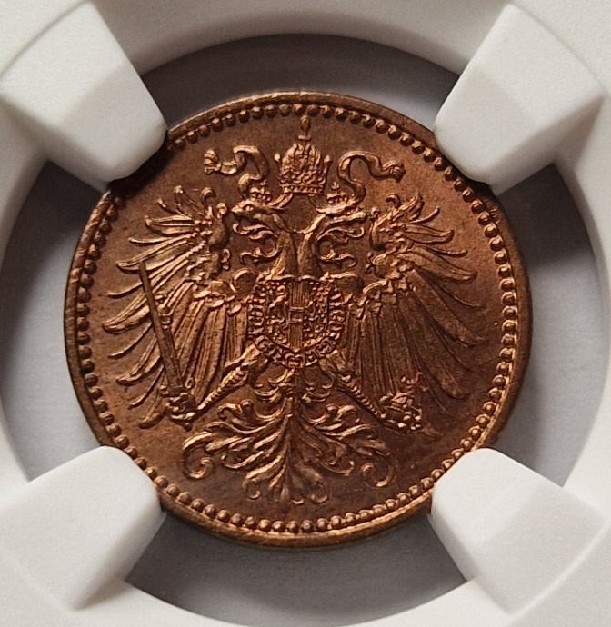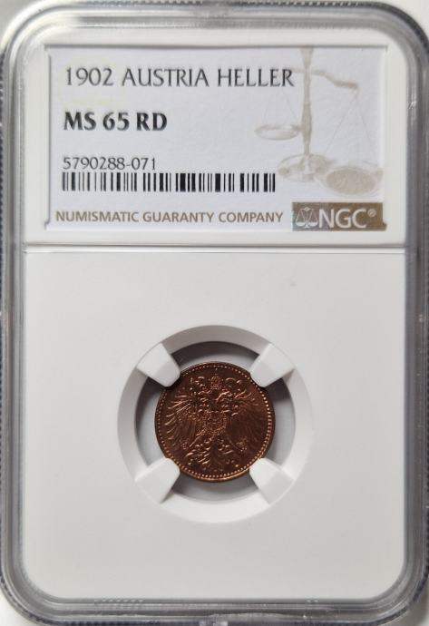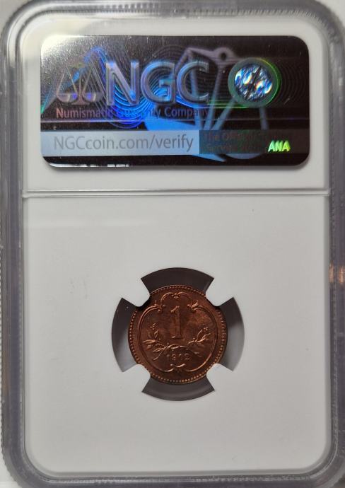 Perfektno ohranjen 1 heller v polnem kovnem sijaju. Zelo redko. Uradno ocenjen, certificiran in kapsuliran - NGC MS 65 RD.