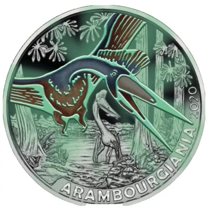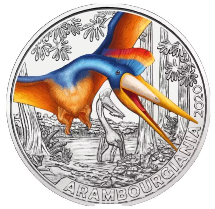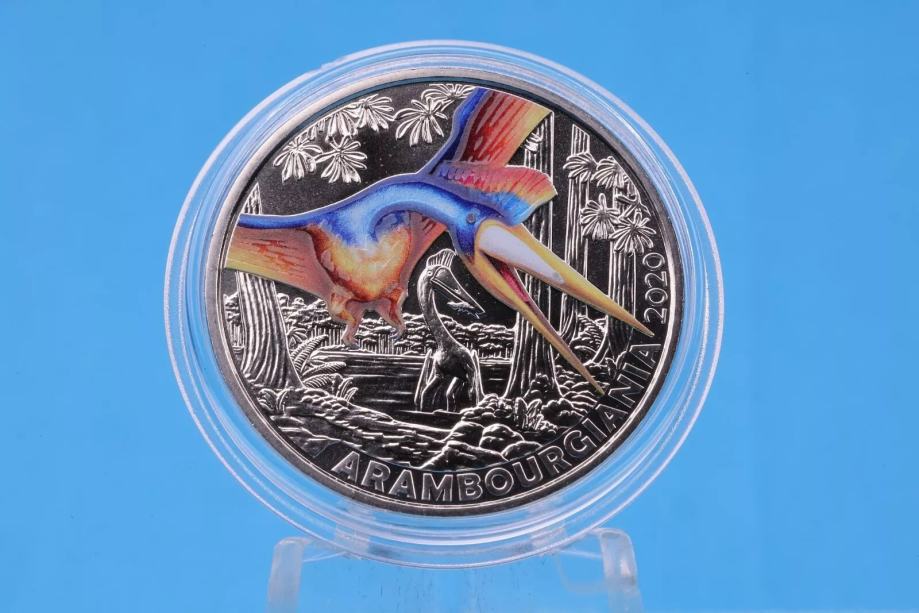 Iz lastne zbirke se prodaja avstrijski kovanec iz serije Dinozavri - Arambourgiania. Motiv na kovancu v temi postane svetleč.