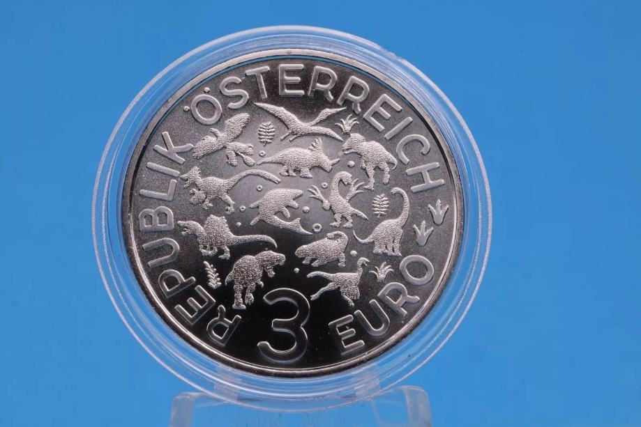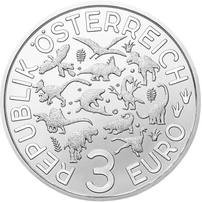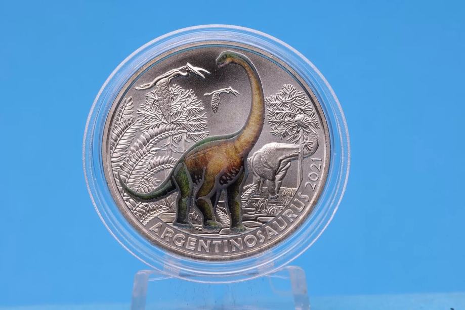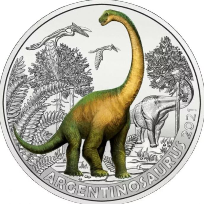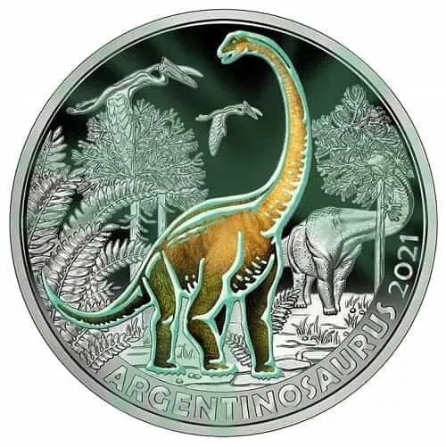 Iz lastne zbirke se prodaja avstrijski kovanec iz serije Dinozavri - Argentinosaurus. Motiv na kovancu v temi postane svetleč.