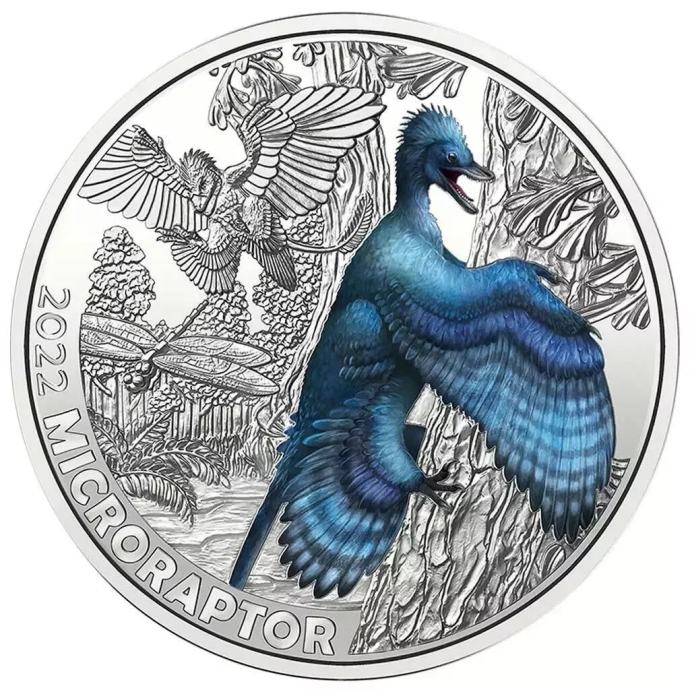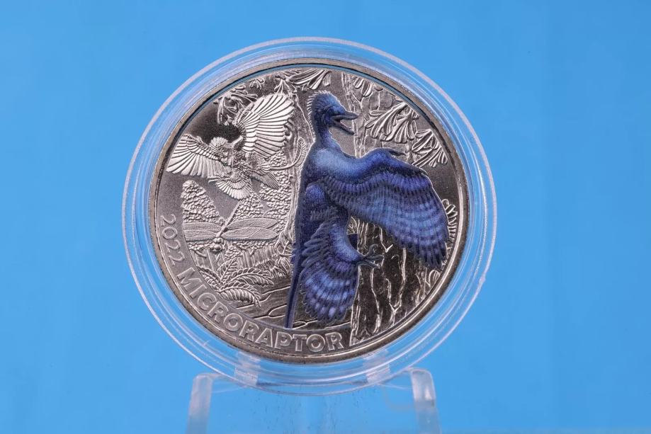Iz lastne zbirke se prodaja avstrijski kovanec iz serije Dinozavri - Microraptor. Motiv na kovancu v temi postane svetleč.