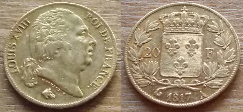 20 Francs 1817 A (kovnica Pariz), ohranjenost VF-EF, 810 €