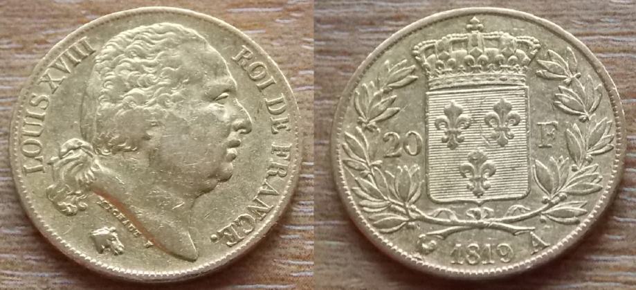 20 Francs 1819 A (kovnica Pariz), ohranjenost VF, 780 €