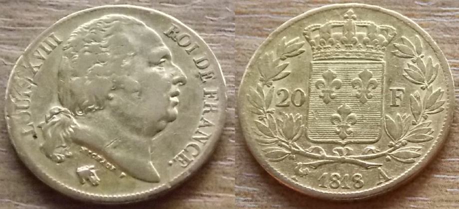 20 Francs 1818 A (kovnica Pariz), ohranjenost VF, 780 €