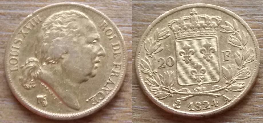20 Francs 1824 A (kovnica Pariz), ohranjenost VF-EF, 830 €