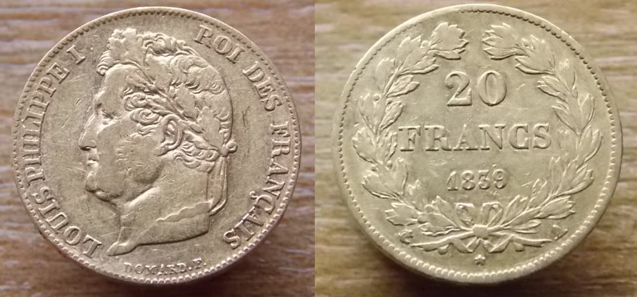 20 Francs 1839 A (kovnica Pariz), ohranjenost VF cena 745eur