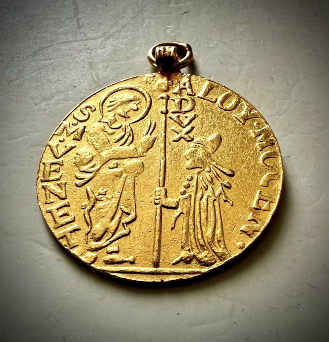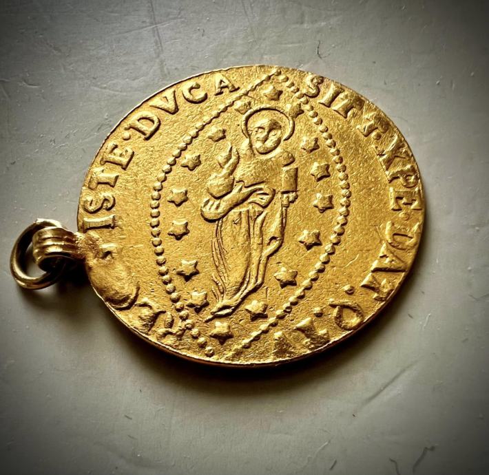 Lepo ohranjen zlati beneški cekin, s staro zlatarsko predelavo, namenjen nošenju na verižici.