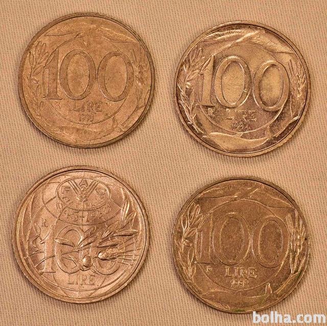 Ugodno prodam kovance Italije za 100 lir, letnic 1993, 1994, 1995, 1998, kvalitete zelo lepi do odlični (VF/XF). KM#159, z letnico 1995 KM#180. Cena po 1 EUR. Kovanci so na sliki.