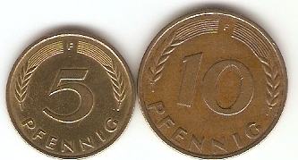 10 pfennig 1950f,50d-0,60,50,j,66f,70d,71j,71d,72g,72d,78j, 80d,90a,90d,92j 0,30€
