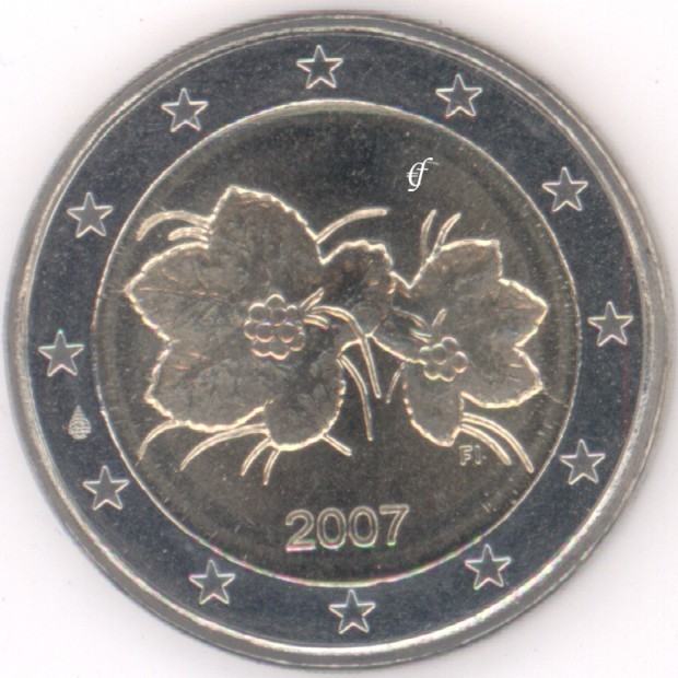 Prodam evrski KOVANEC za 2 evra - spominski evrokovanec (evro, euro, EUR, €): FINLAND CLOUDBERRIES AND CLOUDBERRY FLOWERS - SUOMI FINLAND - Finska 1st, leto izdaje 1999 in 2004 M, na katerem je upodobljen simbol Finske (Cloud Berries and Cloudberry Flowers - Barjanska robida), ki so ob zunanjem delu obkroženi z dvanajstimi zvezdami Evrope. S strani fino rebrast rob z napisom: "SUOMI FINLAND" (Finska v finščini in švedščini) ter tremi levjimi glavami. Graver: Raimo Isma Heino. Kovnica: Mintmark of Mint of Finland (FI) Mint of Finland (Suomen Rahapaja), Vantaa, Finland.