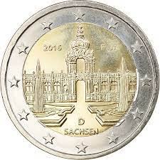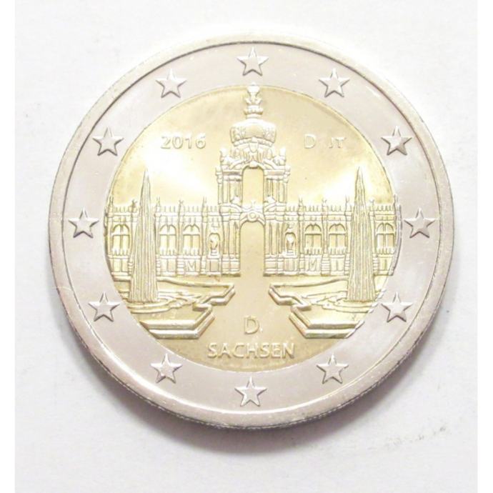 Prodam evrski KOVANEC za 2 evra - spominski evrokovanec (evro, euro, EUR, €): GERMANY SACHSEN Bundesländer Deutschland (Federal states Saxony - Zvezne dežele Saška), leto izdaje 2016, na katerem je upodobljen pogled z notranjega dvorišča svetovno znanega dresdenskega Zwingerja na kronska vrata. Na notranjem delu je izpisano ime: 'SACHSEN' in koda države izdajateljice: 'D' na dnu, oznaka kovnice ‘D’/'F' in oznaka graverja: začetnici „JT“ — Jordi Truxa desno na vrhu in letnica izdaje: '2016' levo na vrhu. Ob robu napis: 'EINIGKEIT UND RECHT UND FREIHEIT' (prevod: Enotnost, pravičnost in svoboda). Kovnica: D Munchen, Nemčija / F Staatliche Münze Baden-Württemberg, Stuttgart, Nemčija.
