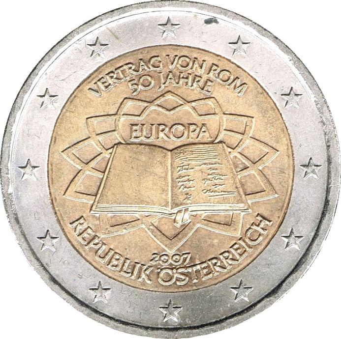 Prodam evrski KOVANEC za 2 evra - spominski evrokovanec (evro, euro, EUR, €): VERTRAG VON ROM, 50 JAHRE, EUROPA, 2007, REPUBLIK ÖSTERREICH - 50. obletnica Rimske pogodbe. Na kovancu je prikazan dokument pogodbe, ki ga je podpisalo 6 držav ustanoviteljic; ozadje spominja na tlakovanje trga Piazza del Campidoglio v Rimu (ki ga je oblikoval Michelangelo in je bilo izvedeno 25. marca 1957), zgoraj sledi zapis v nemškem jeziku: VERTRAG VON ROM, 50 JAHRE (50 let rimske pogodbe), nižje: EUROPA ter na dnu leto izdaje: 2007 in ime države izdajateljice: REPUBLIK ÖSTERREICH (Republika Avstrija). Tako se legenda od države do države razlikuje, podoba pa je enaka. Kovanje: Dunaj, Avstrija.