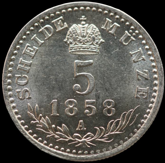 LaZooRo: Avstrija 5 Kreuzer 1858 A UNC ukrivljen G - Srebro