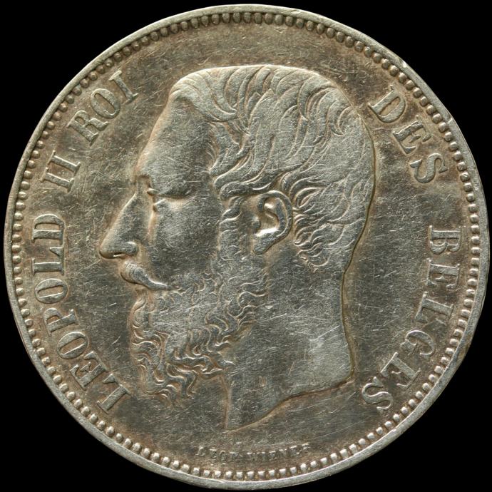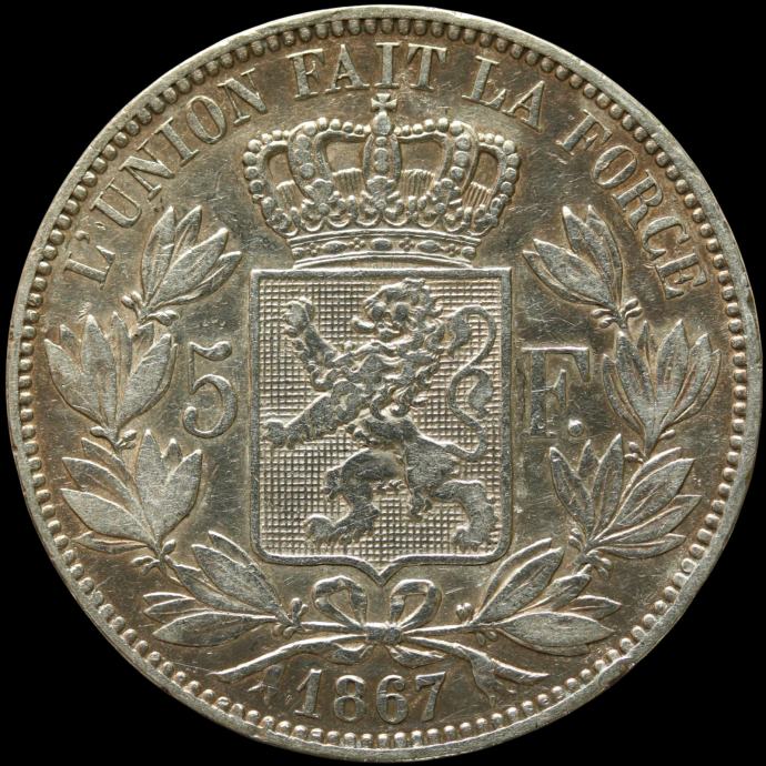 LaZooRo: Belgija 5 Francs 1867 VF / XF - srebro