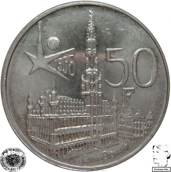 LaZooRo: Belgija 50 Francs 1958 UNC d - Srebro