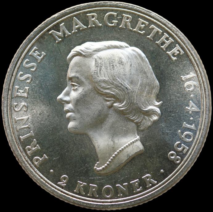 LaZooRo: Danska 2 Kroner 1958 UNC PROOF MATE 18. rojstni dan princese Margrethe - srebro