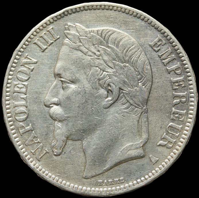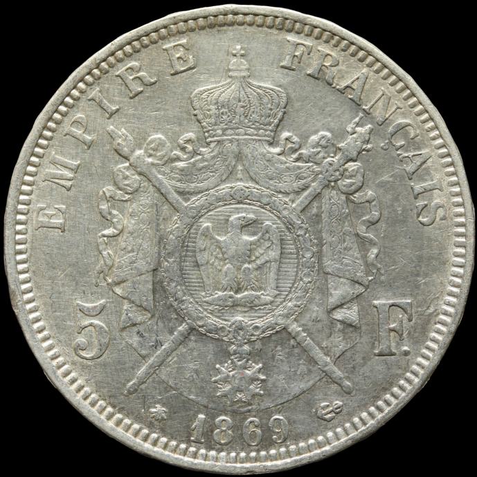 LaZooRo: Francija 5 Francs 1869 A VF/XF - Srebro