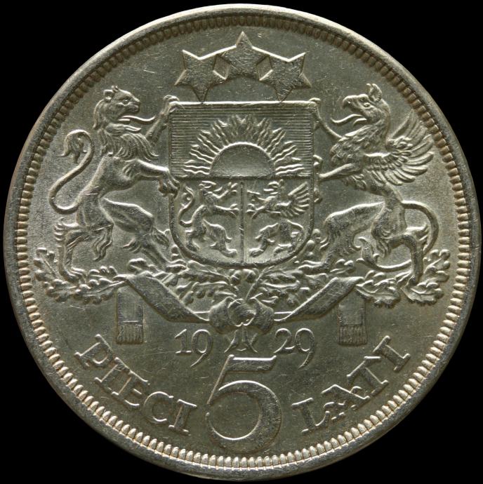 LaZooRo: Latvija 5 Lati 1929 UNC - srebro