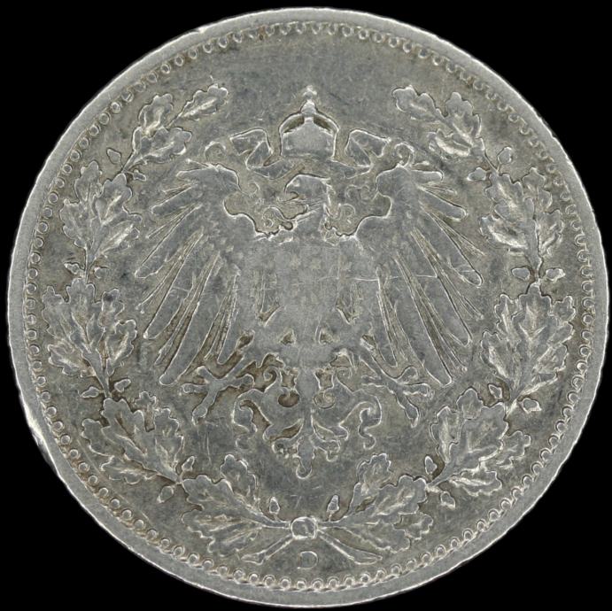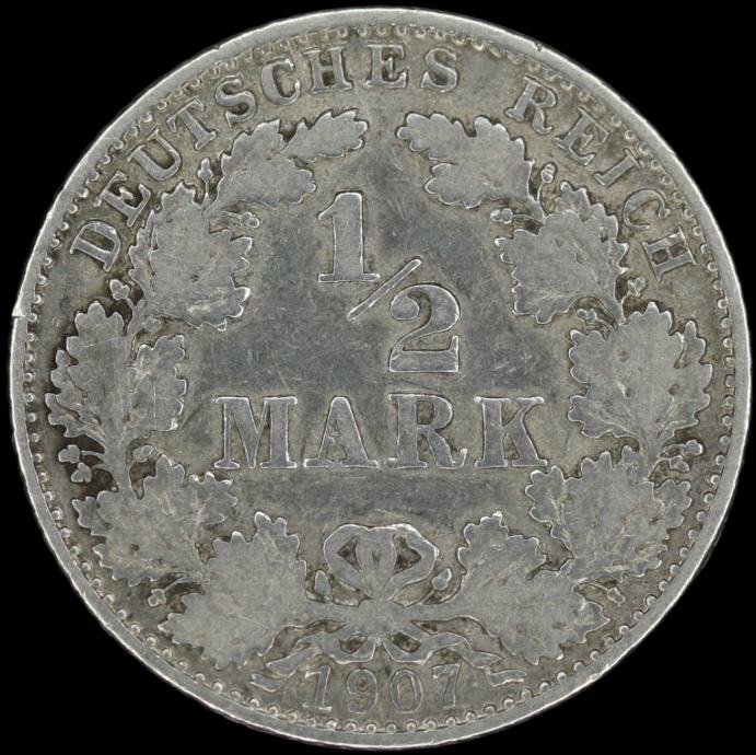LaZooRo: Nemčija 1/2 Mark 1907 D VF / XF - srebro
