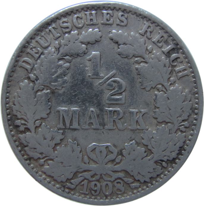 LaZooRo: Nemčija 1/2 Mark 1908 J VF - Srebro