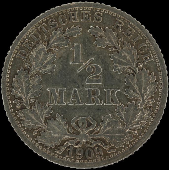 LaZooRo: Nemčija 1/2 Mark 1909 F prek F UNC – srebro KM# 17 1/2 MARK