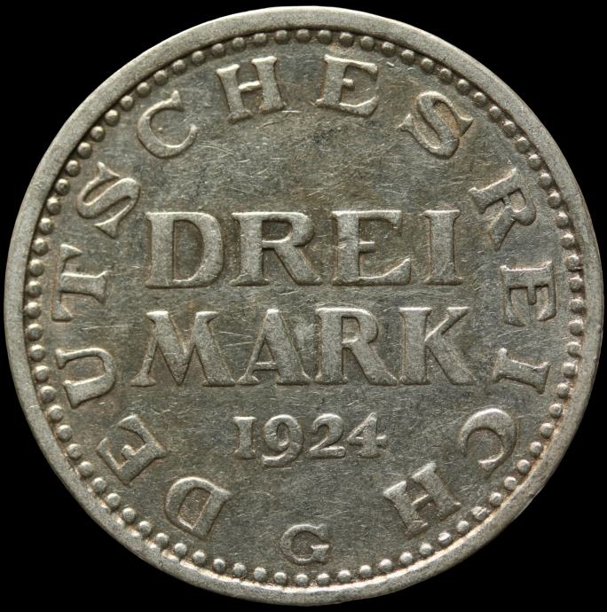 LaZooRo: Nemčija 3 Mark 1924 G VF / XF - srebro