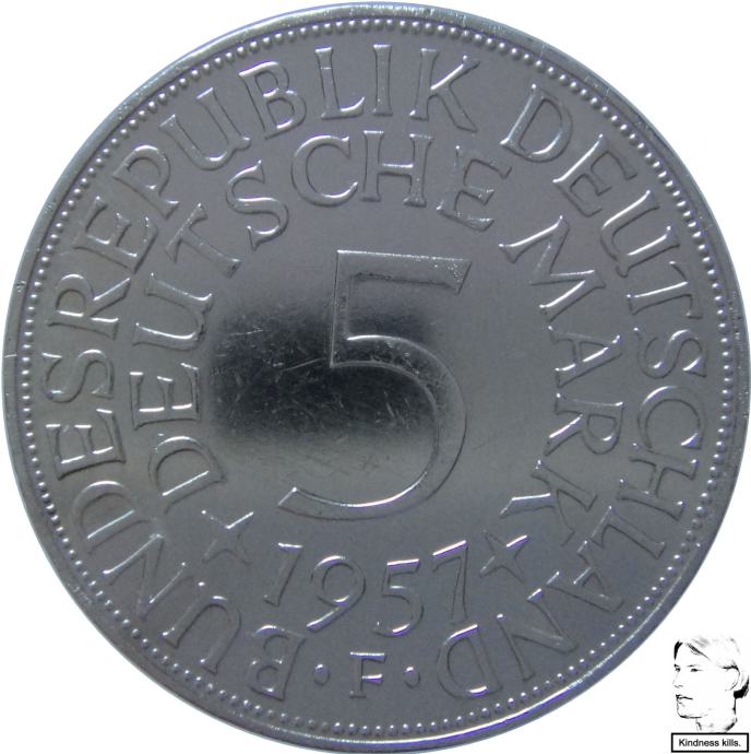 LaZooRo: Nemčija 5 MARK 1957 F PROOF zelo redek - Srebro