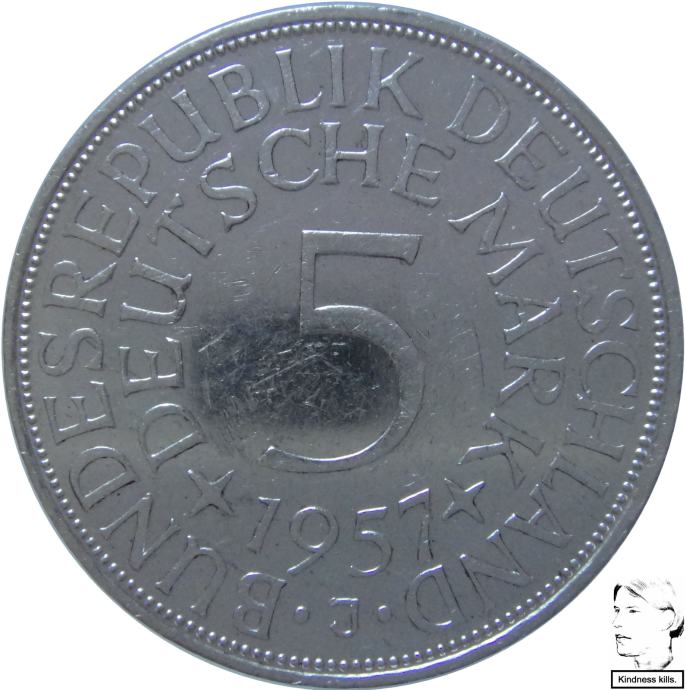 LaZooRo: Nemčija 5 MARK 1957 J PROOF zelo redek - Srebro