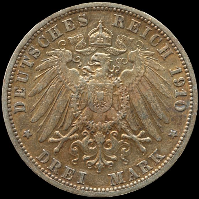 LaZooRo: Nemčija BADEN 3 Mark 1910 G XF / UNC - srebro