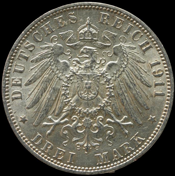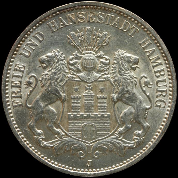 LaZooRo: Nemčija HAMBURG 3 Mark 1911 J UNC - srebro