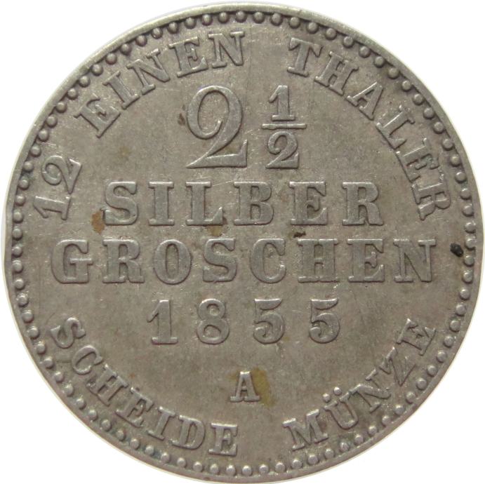 LaZooRo: Nemčija PRUSSIA 2 1/2 Groschen 1855 A XF - Srebro