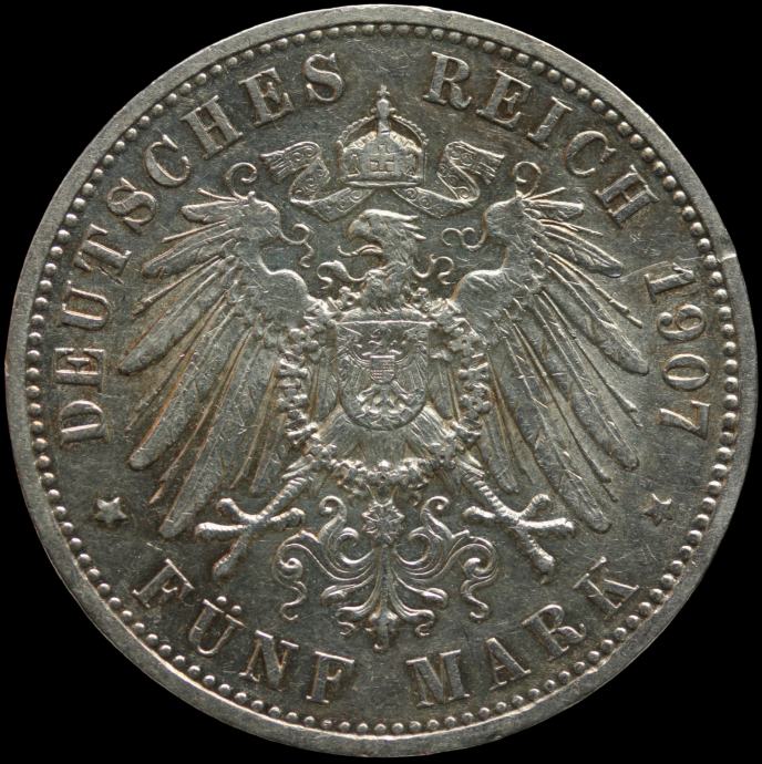 LaZooRo: Nemčija PRUSSIA 5 Mark 1907 A VF / XF - srebro