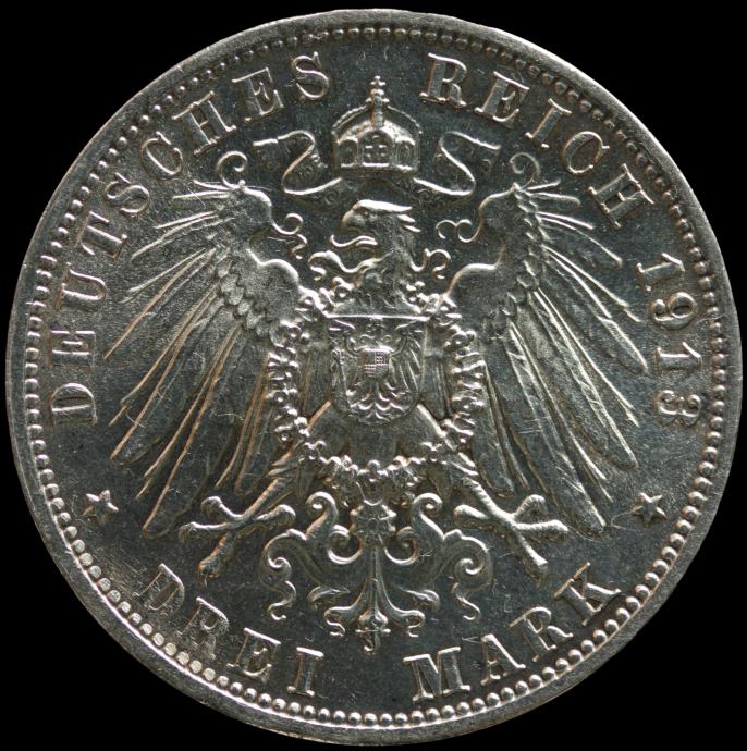 LaZooRo: Nemčija SAKSONIJA - ALBERTINE 3 Mark 1913 E XF / UNC - srebro