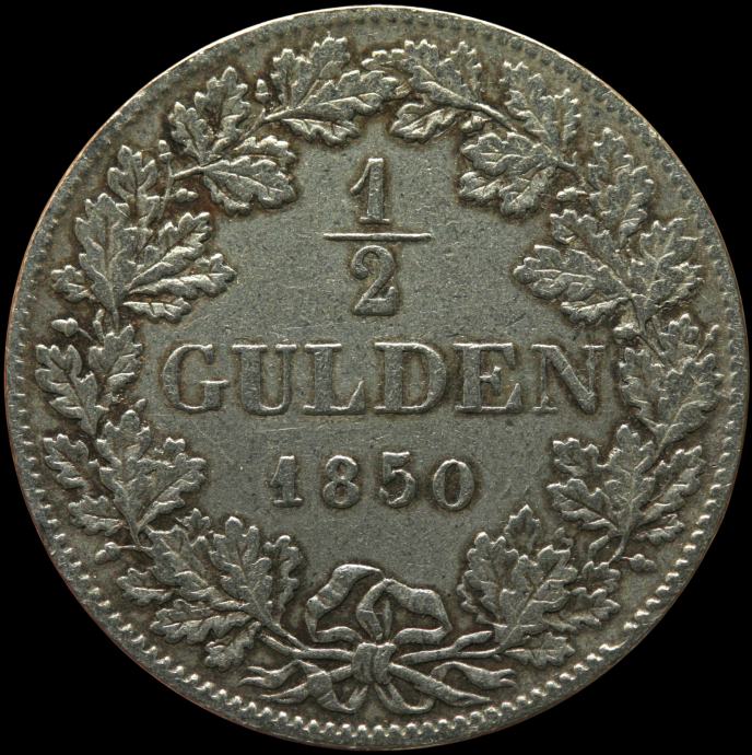 LaZooRo: Nemčija WÜRTTEMBERG 1/2 Gulden 1850 VF / XF redkejši - srebro