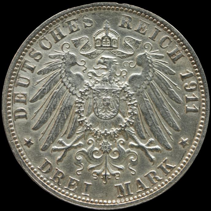 LaZooRo: Nemčija WÜRTTEMBERG 3 Mark 1911 F XF / UNC poroka - srebro