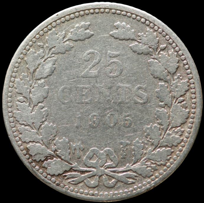 LaZooRo: Nizozemska 25 Cents 1905 VF - srebro